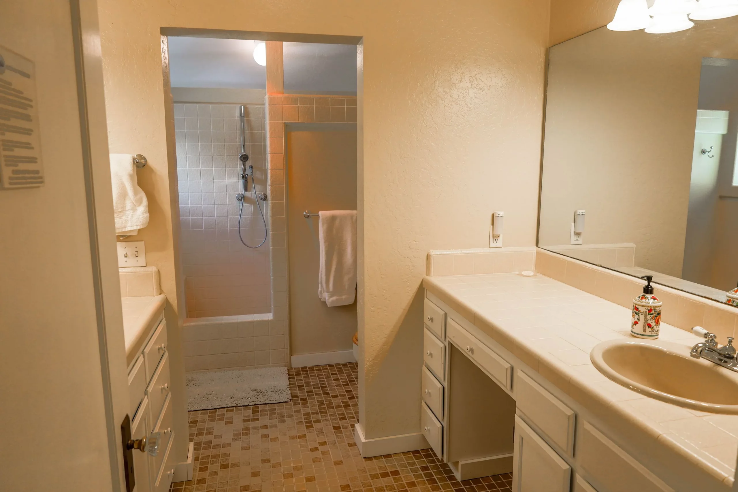 Enjoy a spacious bathroom complete with a large shower, giving you plenty of room to refresh and unwind after a day of exploring.