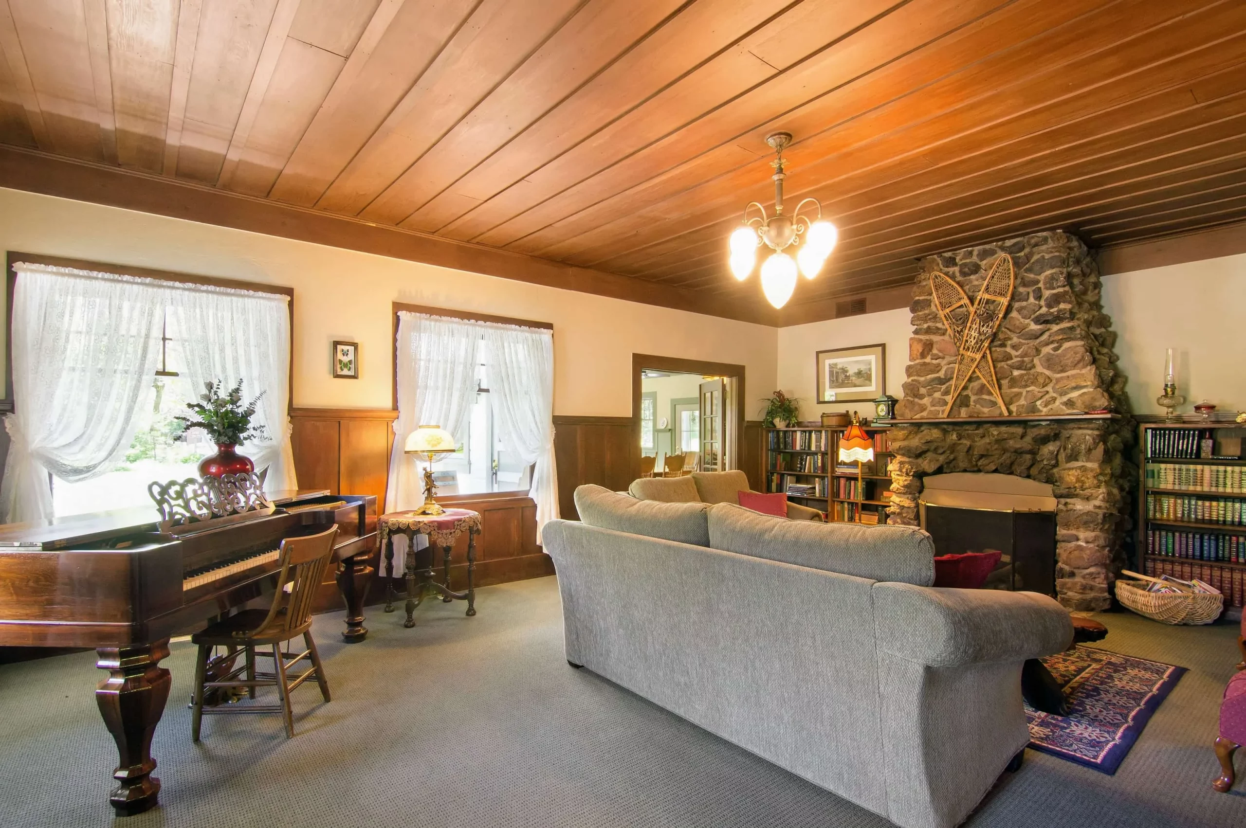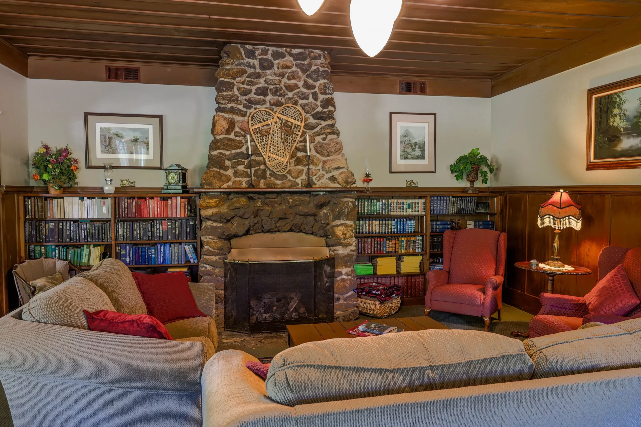 Massive rock fireplace, library, comfortable seating.