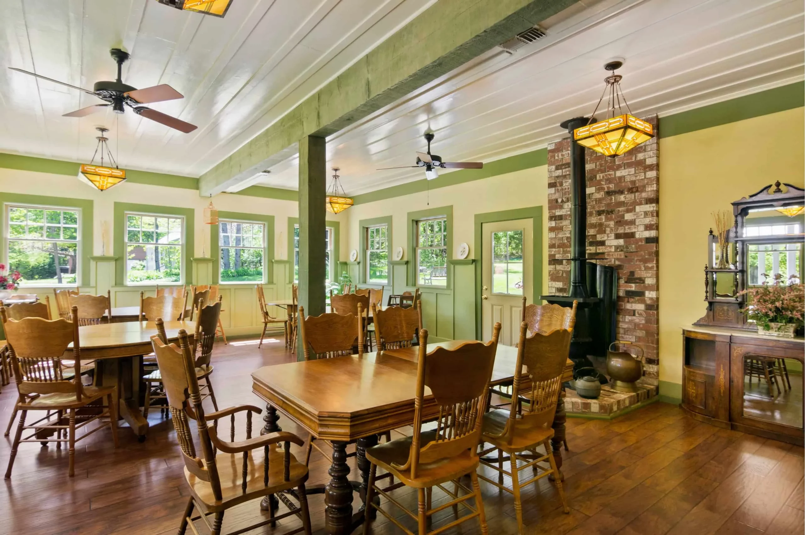 With many windows overlooking the garden. Comfortable seating for 2 dozen.